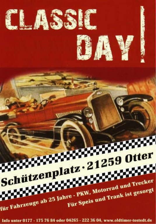 Am 17. Mai 2020 findet auf dem Schützenplatz in Otter Samtgemeinde Tostedt im Landkreis Harburg der 7. Classic Day statt. Alle PKW, Motorräder und Trecker ab einem Alter von 25 Jahren haben kostenfreien Einlass auf das Ausstellungsgelände. Bestaunen Sie die Oldtimer!