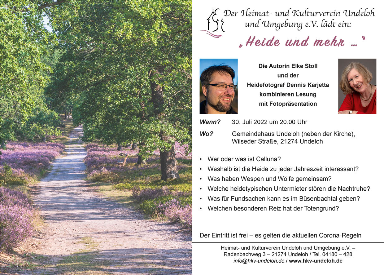 | KostenlosDer Heimat- und Kulturverein Undeloh und Umgebung e.V. lädt ein: Die Autorin Elke Stoll und der Heidefotograf Dennis Karjetta kombinieren Lesung mit Fotopräsentation