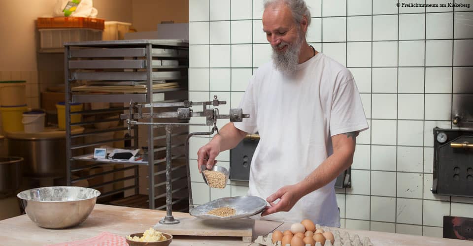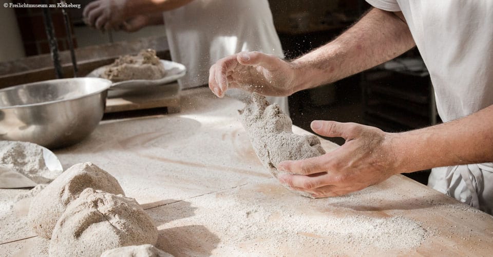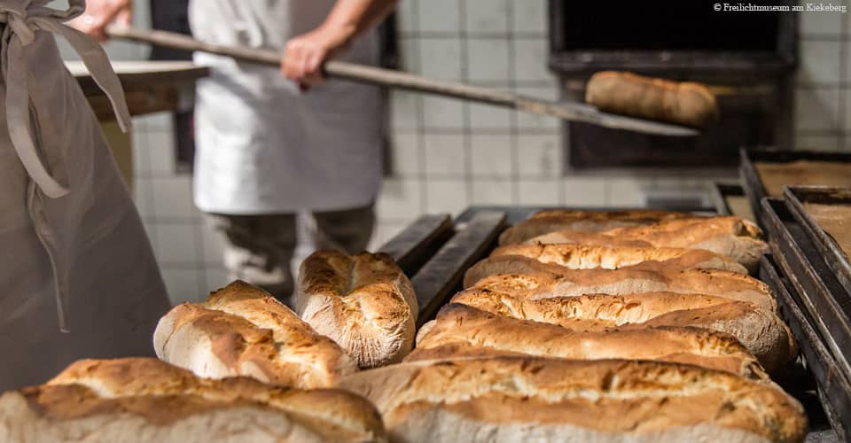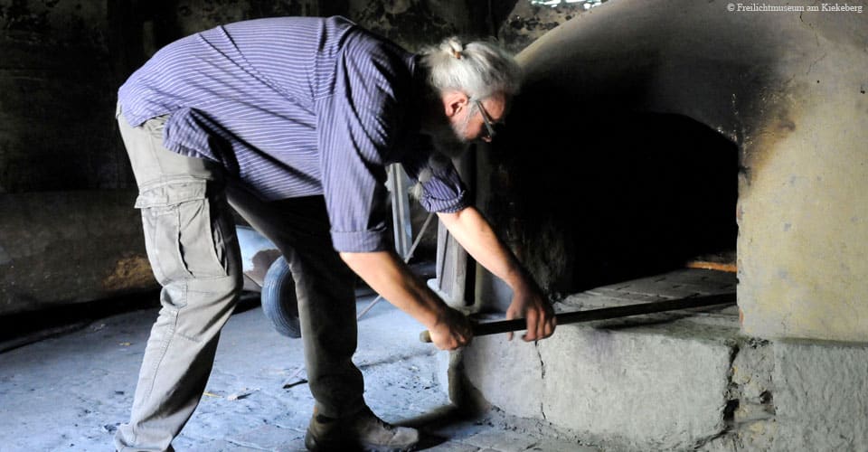 Die Bäcker am Kiekeberg backen noch traditionell nach alter Handwerkskunst. In den historischen Holzbacköfen der museumseigenen Bäckerei werden von Sonnabend bis Dienstag zum Beispiel Roggenschrotbrot oder Heidesand-Kekse gebacken. Sonntags feuern Heiko Hieronymus und sein Team zusätzlich auch den großen Lehmbackofen auf dem Gelände des Freilichtmuseums an. Lehmbacköfen wurden bereits im Mittelalter genutzt: Das Anheizen ist sehr aufwändig und dauert mehrere Stunden, aber den Broten verleiht das eine besonders feste Kruste.