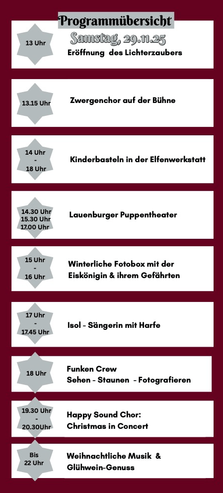 17.30–18.00 Uhr – Lichterzauberumzug mit Reit- und Fahrverein, Spielmannszügen der Musikvereinigung und dem Schützenverein. Leuchtende Ballons sorgen für strahlende Kinderaugen.